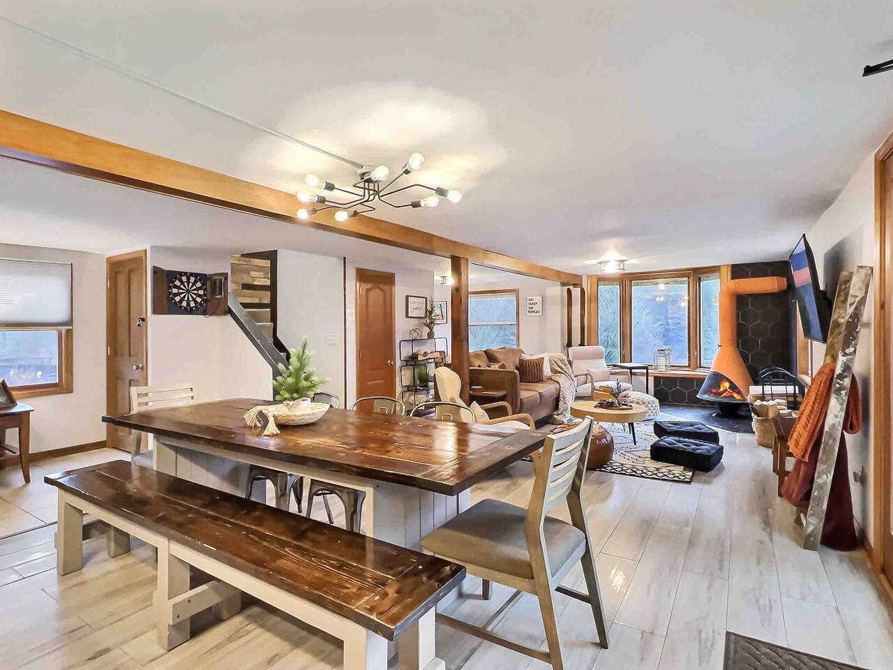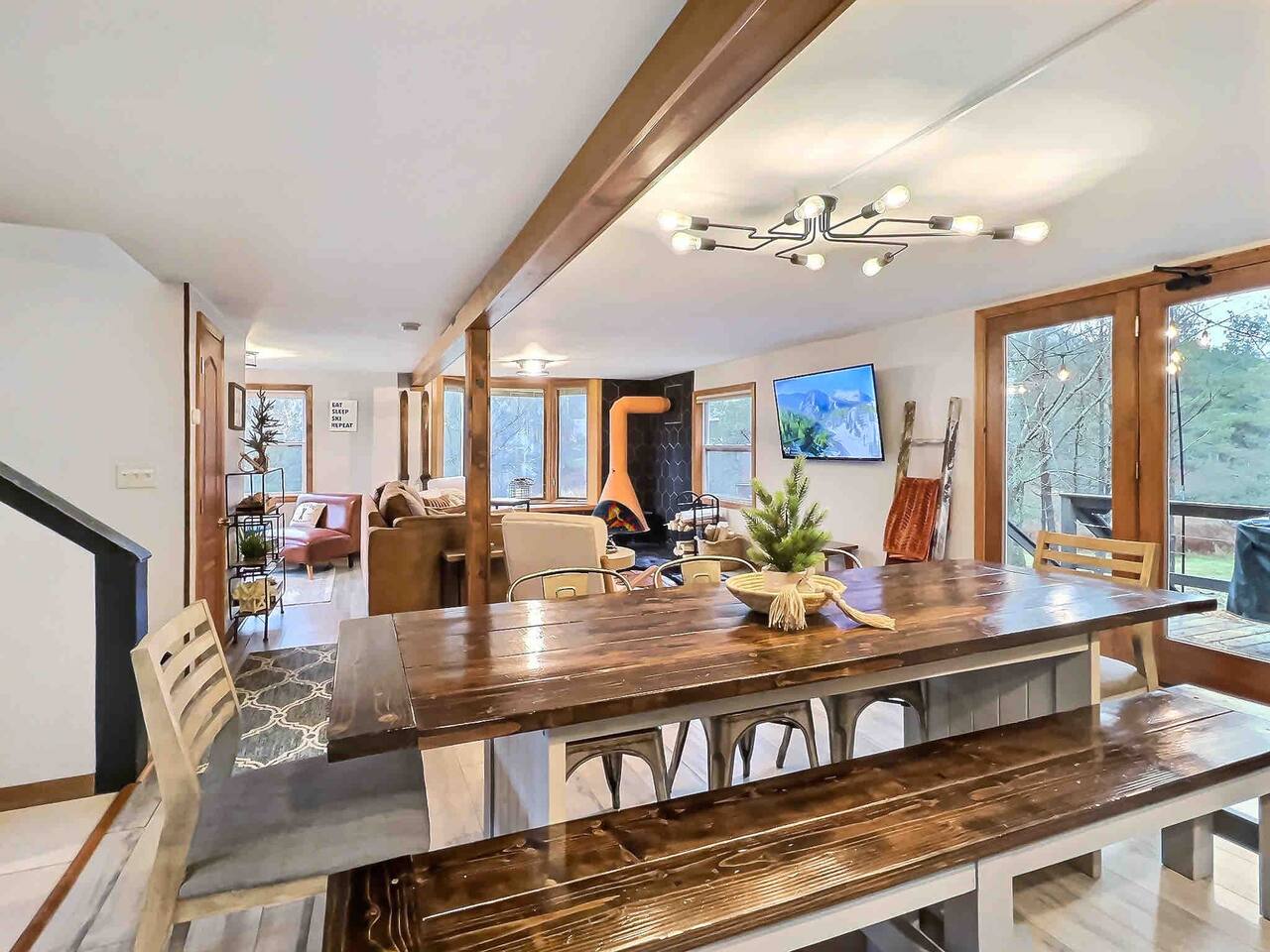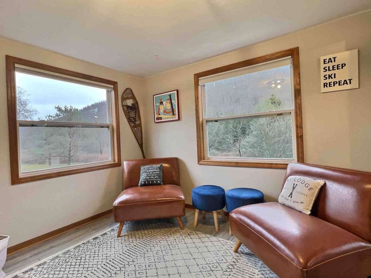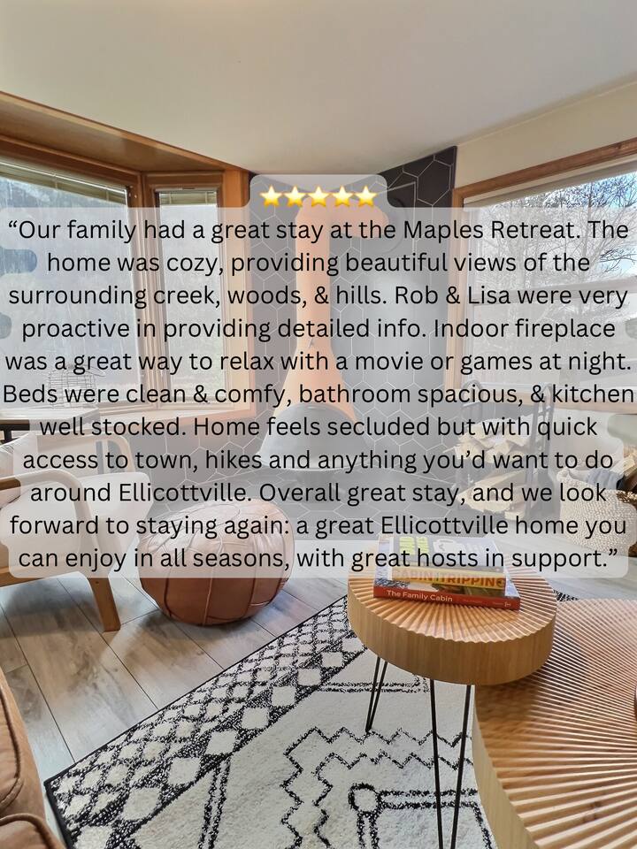 🏔 Why Guests Love Maples Retreat ✔ 1.7 miles to Village ✔️ Minutes to Holiday Valley & HoliMont ✔ Wood-burning fireplace (firewood provided Oct–Mar) ✔ Sleeps up to 8 guests comfortably ✔ Heated floors throughout — perfect for winter stays ✔ Fast Wi-Fi + strong cell service ✔ Quiet, scenic setting yet close to town ⸻ 🛏 Sleeping Arrangements (Sleeps 8) Perfect for families or multiple couples: • Bedroom 1: King bed • Bedroom 2: Two queen beds • Bedroom 3: Twin bunk beds + one queen bed All bedrooms are thoughtfully decorated for a cozy ski-town feel. ⸻ 🍽 Kitchen & Dining Cook and gather with ease: • Full kitchen with granite countertops • Complete cookware & dishes • 12-cup coffee maker • Large dining table seating up to 8 Ideal for après-ski dinners and long weekends. ⸻ 🔥 Living & Entertainment Spaces • Open-concept first floor • Mid-century wood fireplace • Roku 4K Smart TV + YouTube TV • Dart board, board games & kids’ TV room • Bring your own gaming system for movie nights or downtime ⸻ 🌲 Outdoor Space (Private 2 Acres) Enjoy the outdoors year-round: • Weber grill • Outdoor fire pit • Large private entryway — perfect for skis, boots & gear • Beautiful views and peaceful surroundings ⸻ 🧺 Comfort & Convenience • Washer & dryer • All linens & towels provided • Hair dryer & iron included • Clean, modern, and thoughtfully stocked ⸻ 🍽 Optional Upgrade Ask about our private Chef services — perfect for special occasions or group dinners. ⸻ 💸 Extended Stay Savings Book 5+ nights and receive 20% OFF Perfect for ski weeks, holiday stays, or remote work getaways. ⸻ ❤️ Save for Later Tap the Heart icon to save Maples Retreat for ski season, long weekends, and future Ellicottville trips. ⸻ 🚫 House Rules • No parties or events • No pets • Must be 25+ to book