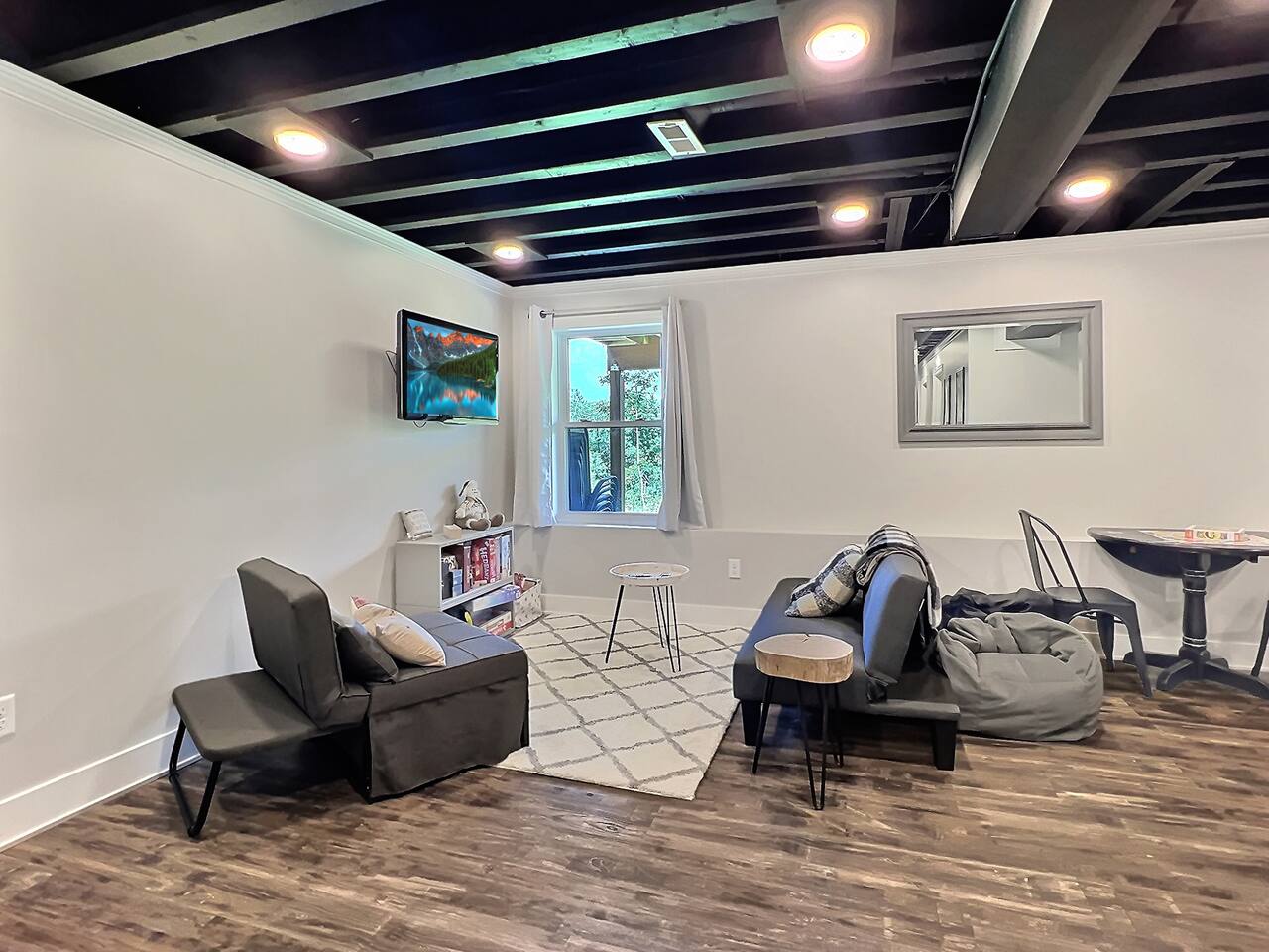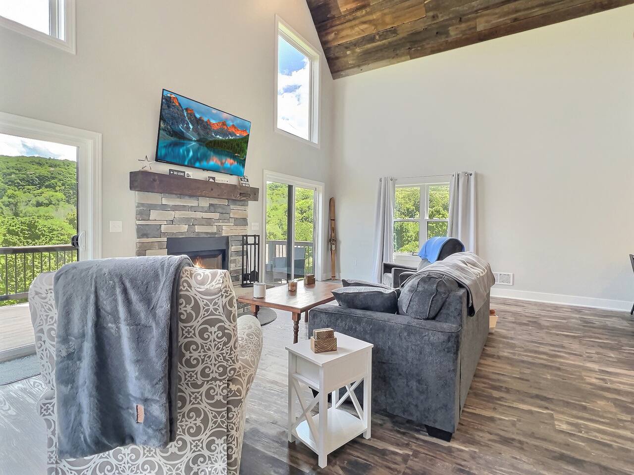 Perfect for 2 families…Newly build A-frame style chalet features a large main living area attached to kitchen with entry and half bath. The lower basement level features 1 full bathroom, a bedroom with a queen bed, 2nd bedroom with 2 bunk beds. Also tv a lounge area. The 2nd floor features a primary bedroom with a king bed and full bathroom. Enjoy large front deck with beautiful views. Perfect space for multiple families!! No Pets Allowed No Events No Parties Min age to book is 25 Electric fireplace Ask about our private Chef services.